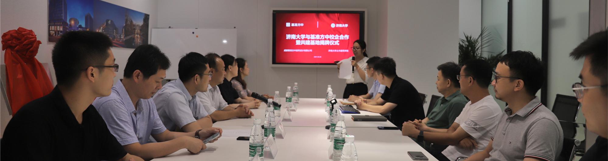 与基准方中校企合作暨共建基地揭牌仪式于成都基准方中建筑设计有限公司济南分公司召开。基准方中济南公司董事长、总建筑师张福岭,济南公司董事、总工程师李长君,济南公司董事、执行总经理李强,副总经理、执行总工程师刘可,执行总建筑师、建筑总监李进,创意执行总监王祥龙,肉视频