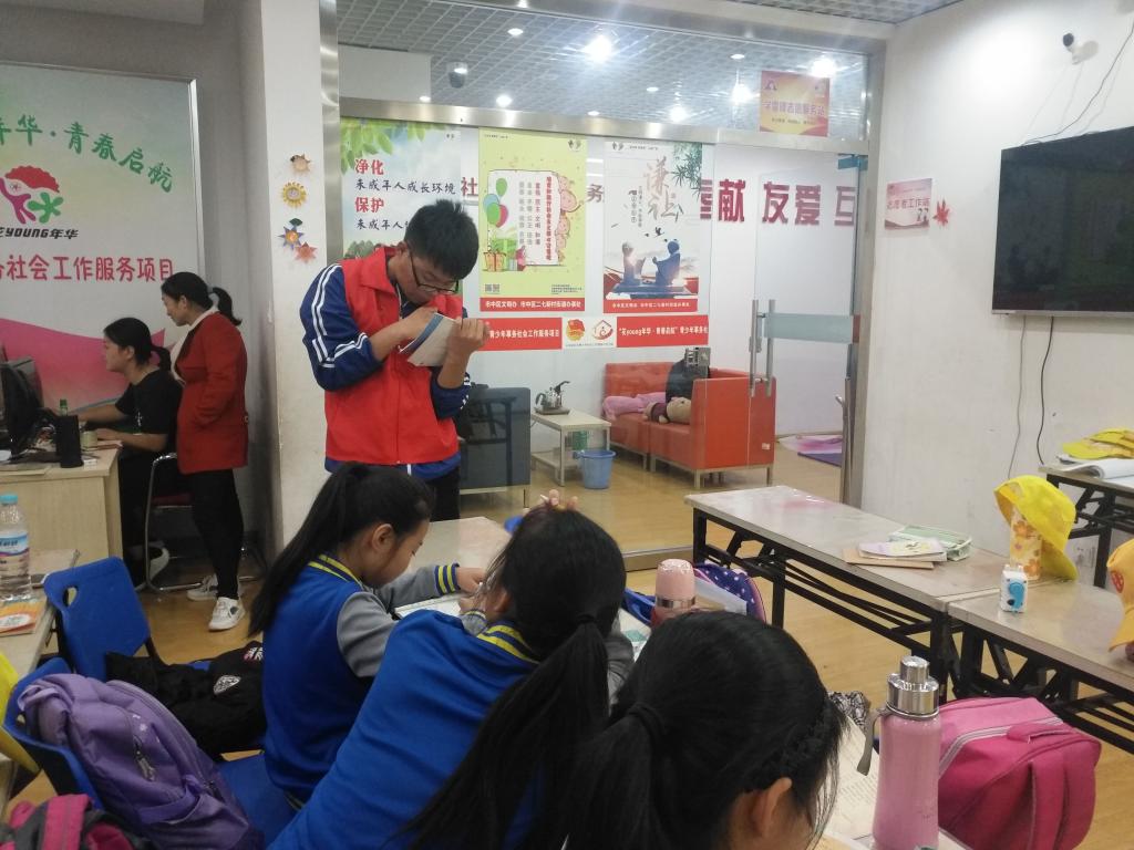 在志愿者做完简短的自我介绍后,一同为小朋友们演唱了《读唐诗》,活跃现场气氛。教室里处处萦绕着欢声笑语,“唐诗像清泉流进我心窝……”一句句回荡在每个人的脑海中。志愿者们以故事与表演相结合的形式为小朋友讲解唐诗《凉州词》、《登鹳雀楼》、《鹿柴》大意,小朋友对此非常感兴趣,想要了解更多诗人的经历。接着,大家举行了诵读小小擂台赛活动,鼓励每个人参与到朗诵当中,并对参与的小朋友给予表扬,希望他们多多进步。最后,志愿者们将手中的几本《唐诗三百首》留给了这群可爱的孩子们,看着他们脸上一直展露着笑容,大家感到由衷的喜悦。